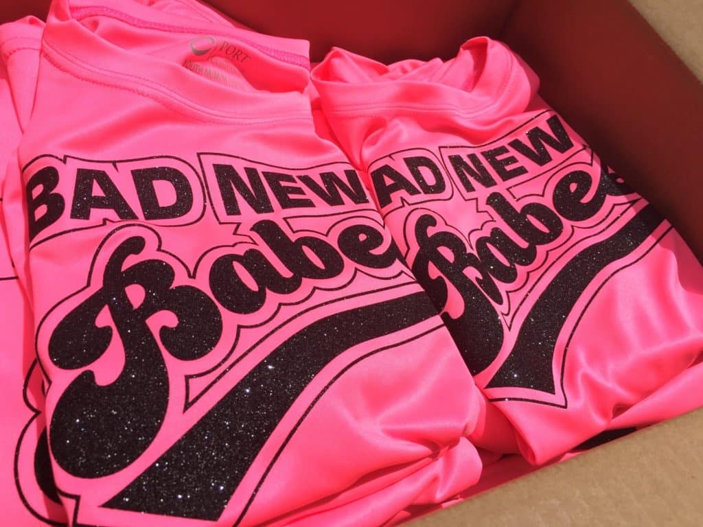 Please note: the Holo Pink and Holo Orange (now with a white backing – but still slightly translucent) have limited opacity when pressing onto dark garments, so for best results please test the effect before doing a large run. UPDATE: The neon colors all have an opaque backing, making them opaque.